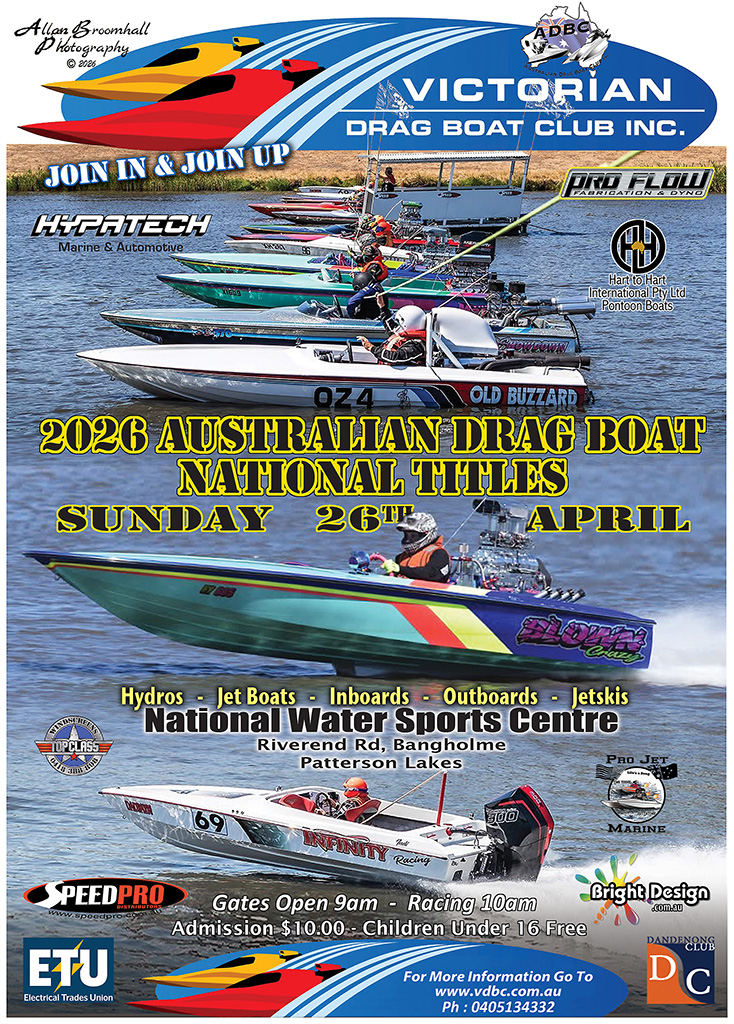 The Victorian Drag Boat Club has been drag boat racing since 1986 and caters for ALL types of boats from the family ski boat to the purpose-built capsule hydro’s capable of over 200mph!